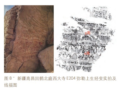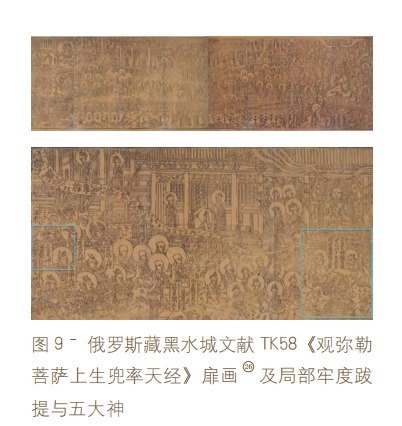 那么我们将前人研究中x与y的身份对调是否就可以了呢?似乎没那么简单。因为正音大神毛孔出水之后,“一一水上有五百亿华,一一华上有二十五玉女”这些情节在x身上都没有体现。联系其他材料,黑水城版刻扉画中二人身份不存在疑问,因为画面布局为横向展开,与壁画制作要求完全不同,更借由榜题清晰界定出人物身份(图9局部牢度跋提与五大神)。就高昌回鹘佛寺与文殊山万佛洞来说,这两处图像则通过同时绘制两身头顶发出摩尼光带的人物从而部分地“缓和”了这一矛盾。